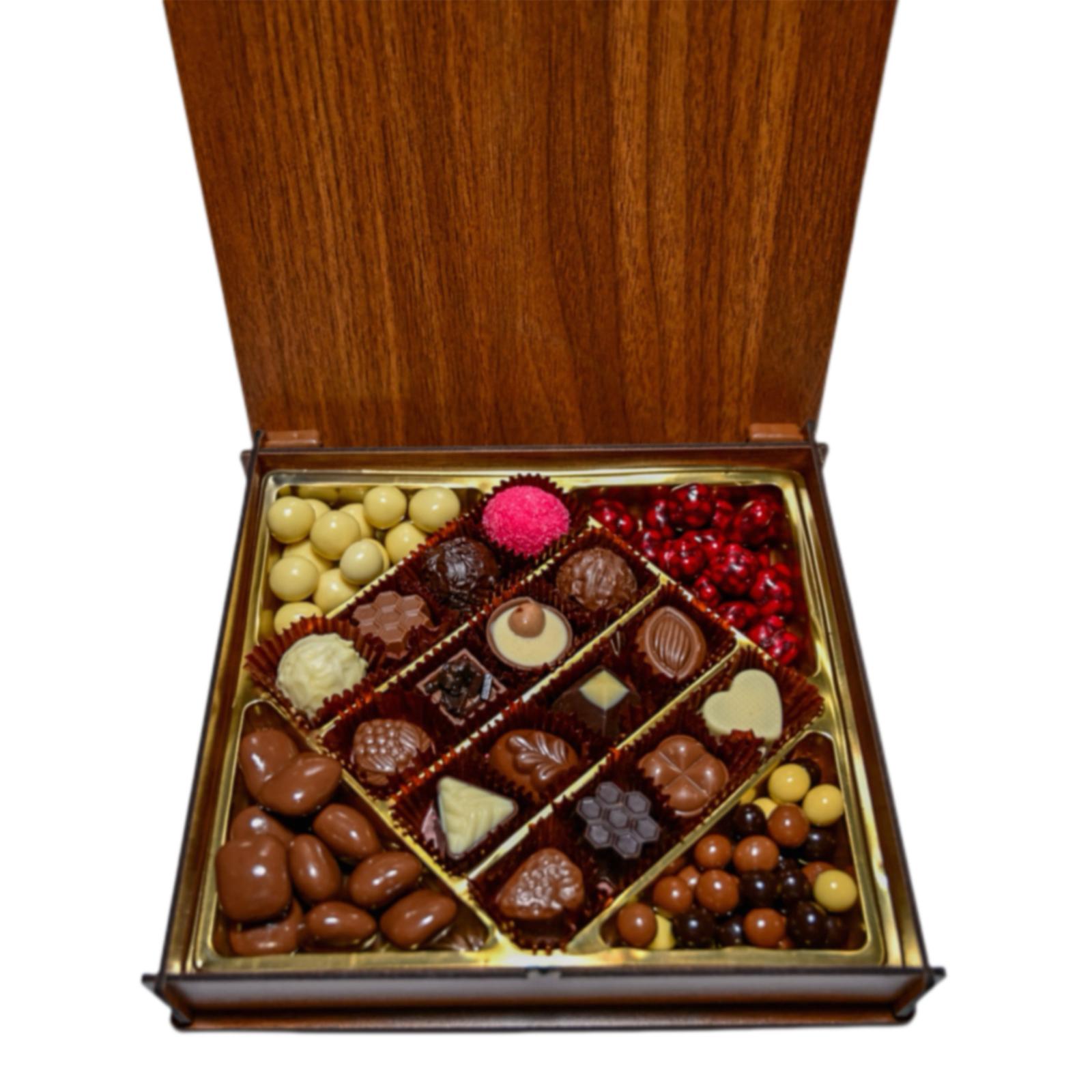 Özenle hazırlanmış, kişiye özel ahşap kutu içerisinde sunulan bu özel çikolata koleksiyonu;